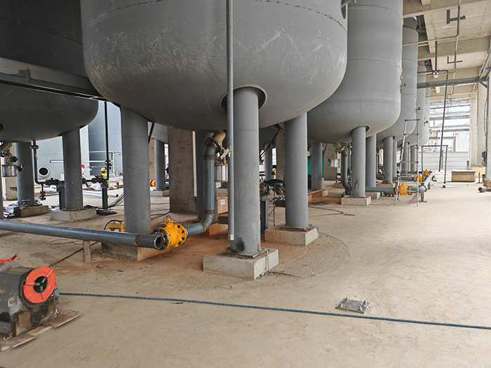 此外,硫化尾氣風機已經(jīng)順利就位,并正在加緊安裝。風機的安裝過程涉及精確的調試和校準工作,施工人員根據(jù)設計要求,對風機的水平度、垂直度等關鍵參數(shù)進行嚴格控制,以確保風機能夠正常運行。 罐體制作情況 多硫化儲罐、三效工藝水儲罐、火堿儲罐和中和水儲罐等關鍵設備已經(jīng)制作完成。在設備制作過程中,公司嚴格按照相關的質量標準和設計規(guī)范進行生產(chǎn)。選用了優(yōu)質的鋼材作為原材料,經(jīng)過下料、焊接、成型等多道工序,確保了罐體的強度和密封性。 精制、水洗、打漿、多硫化工序 精制、水洗、打漿、多硫化工序相關的管道和閥門正在緊鑼密鼓地進行安裝。在管道安裝過程中,嚴格按照工藝流程進行布置,確保物料流動順暢。同時,對閥門進行嚴格的質量檢驗和調試,保證閥門的開閉靈活、密封性能良好。目前已完成大部分管道和閥門的基礎安裝工作。